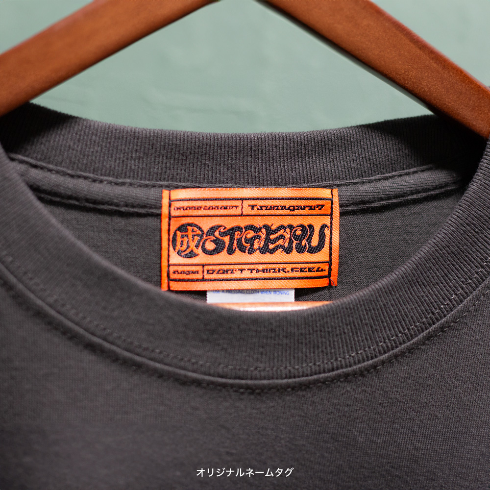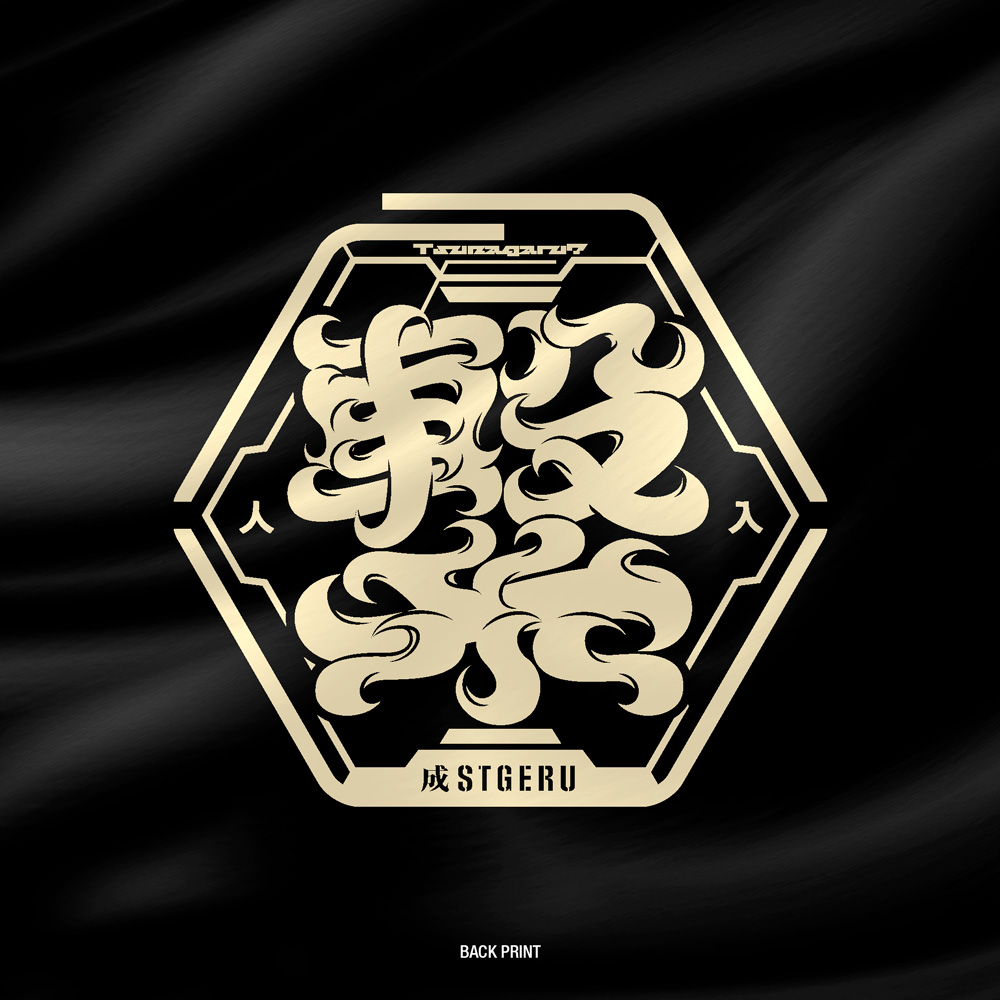背面には成STGERUのコンセプトでもある、「繋る」を家紋風にオリジナル書き起こし書体でデザイン。成STGERUのスタンダードカラーであるCoyote(コヨーテ)を使用。